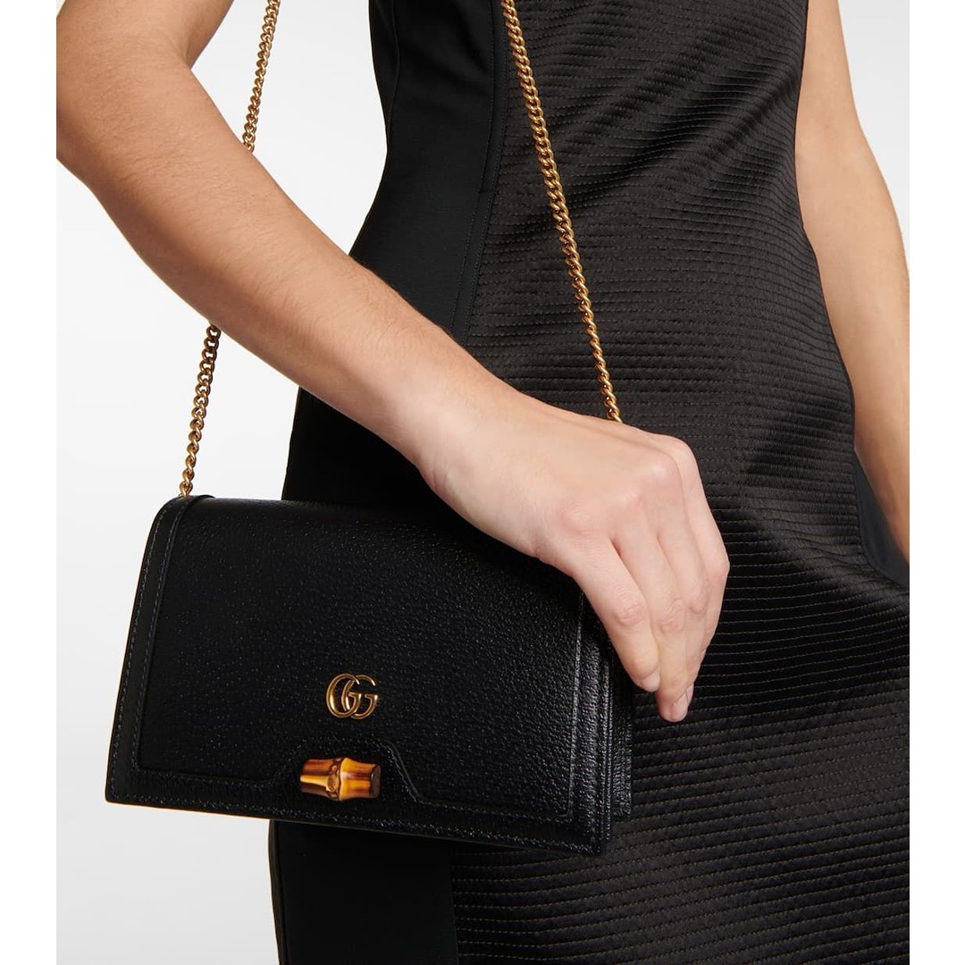 leather, the accessory is completed by Guccio Gucci’s monogram hardware and a delicate chain strap.