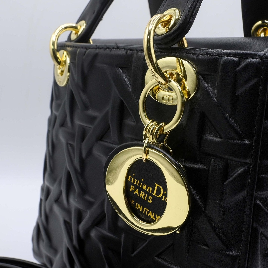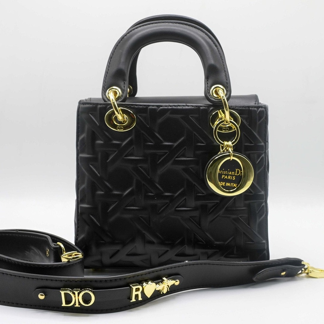 The bag is adorned with polished gold-toned hardware, including the iconic “DI” letter charms that add a personalized touch of glamour. Designed for versatility, it features elegant rounded top handles, making it perfect for both formal events and upscale daily outings.