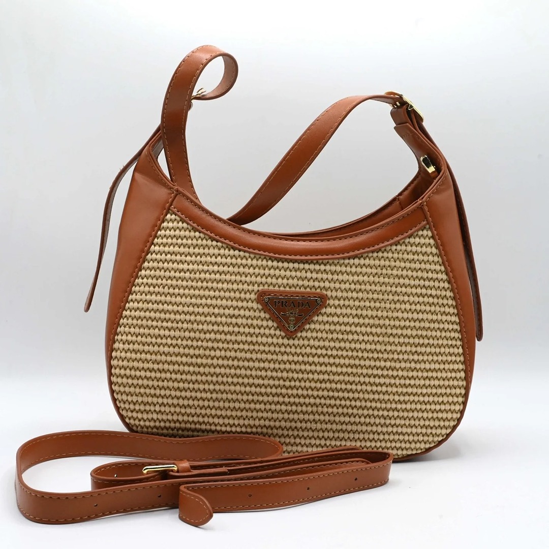 Infuse your style with a touch of artisanal luxury with the PRD Crossbody Bag in Brown. This exquisite accessory masterfully combines natural textures with high-end Italian craftsmanship. Featuring a meticulously woven straw body in a warm tan hue, it is beautifully framed by premium chocolate brown leather trim and polished gold-tone hardware. The signature enameled triangle logo is centered on the flap, serving as a hallmark of quality and sophisticated designer style.