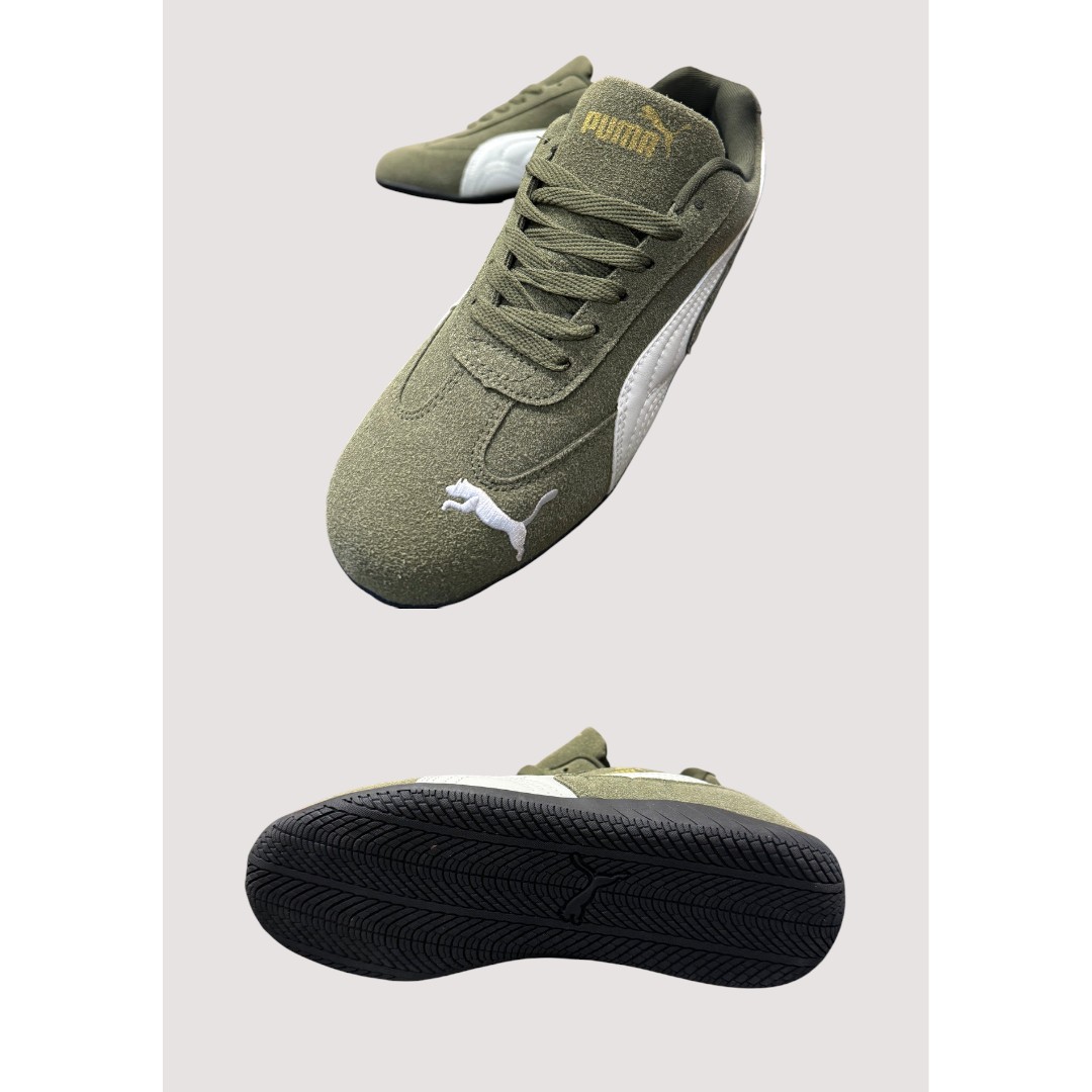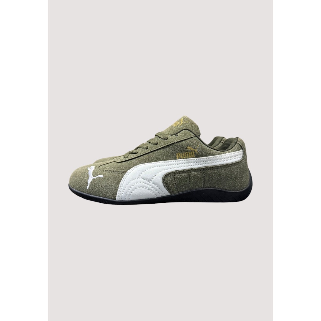 The Puma Speedcat Olive green White, delivers sleek motorsport-inspired style with a soft suede upper, bold white Formstrip, and classic low-profile comfort perfect for everyday wear.