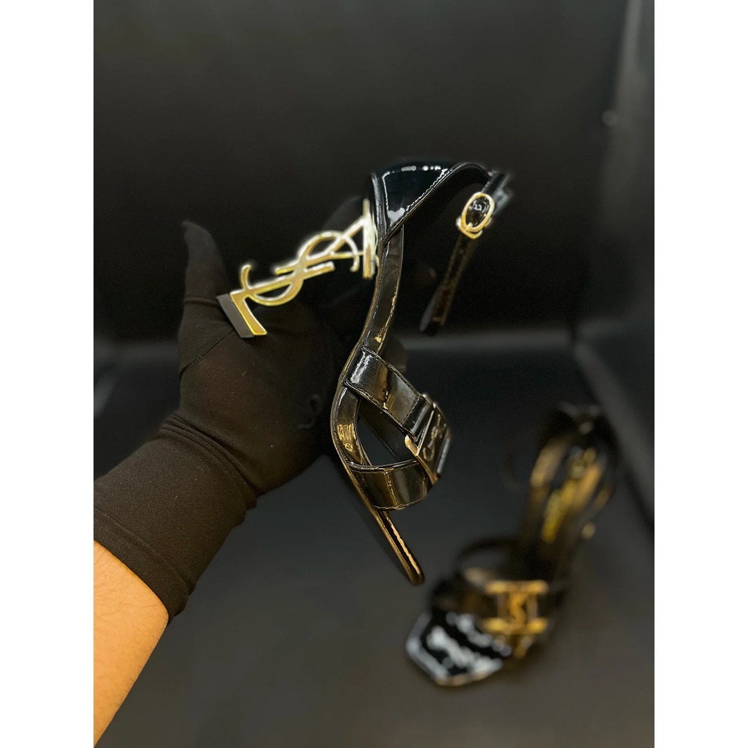 Make a daring fashion statement with the iconic SL Opyum sandals. These high-shine patent leather heels feature the legendary sculptural logo heel in gleaming gold-tone metal.